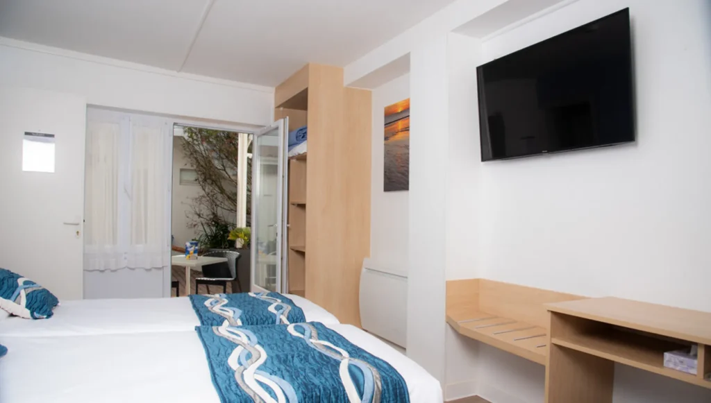 En rez-de-chaussée, 1 chambre avec 1 lit double 160 cm ou 2 lits simples et 1 chambre avec 1 lit double 140 cm, terrasse avec mobilier