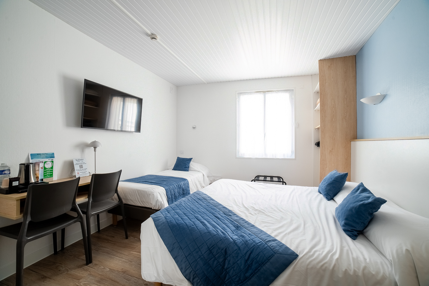 En rez-de-chaussée, chambre  avec lit double 160 cm ou 2 lits simples et 1 lit simple 90 cm.